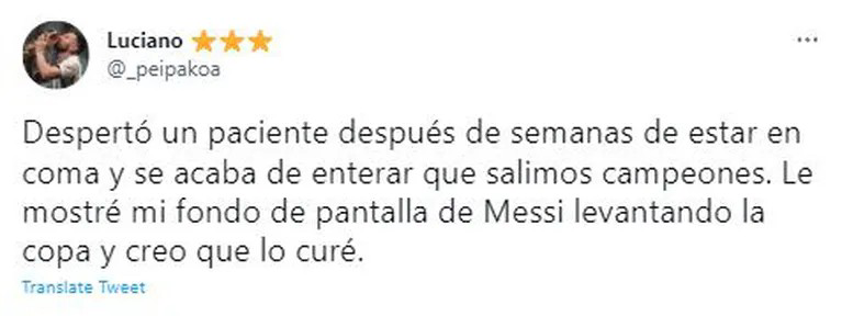 La historia del joven se hizo viral después de que el usuario de Twitter @_peipakoa contará el caso en la red social. “Despertó un paciente después de semanas de estar en coma y se acaba de enterar de que salimos campeones. Le mostré mi fondo de pantalla de Messi levantando la copa y creo que lo curé”, explicó.