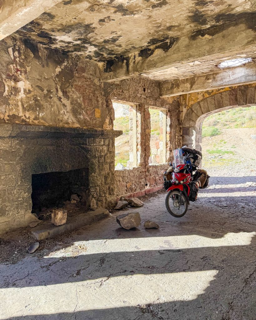 El motoviajero también describe a su manera el impacto que le causó el viejo hotel cordillerano: “El hotel: lindo, bonito, abandonado jajaja. Está buenísimo, de día todo es muy lineal y no pasa de ser bloques de piedras acumulados con forma de paredes, un poco de suciedad (sociedad) y unas vistas tremendas… De noche la cuestión cambia un poco, el viento constante mete su parte tétrica y los ruidos de cosas también están, aunque suelen ser botellas o papeles… te cagás en las patas… ni hablar si te ponés a bajar al piso de abajo, eso sí que no está tan bueno”.