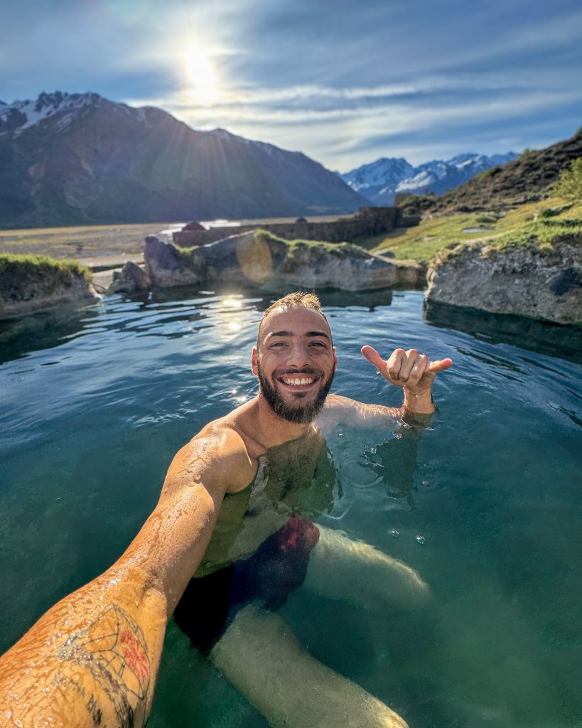 Las termas, en tanto, se ganaron un capítulo aparte en su relato: “Las termas: ¡una locura! No son tan calientes… no sé en verano, pero calientes calientes no estaban. Sí tibias, y obvio que es hermoso meterse ahí, en medio de la cordillera de los Andes, en un pozo natural de agua con un olor a azufre tremendo… salir… te cagás de frío mal jajaja, pero lo vale”.