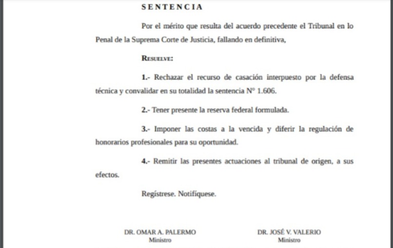 En las últimas horas, se supo que la Suprema Corte de Justicia de la provincia (con las firmas de los jueces Omar Palermo y José Valerio) rechazó el recurso de casación interpuesto por la defensa de Cruzate y le dio la razón a juez Yapur en cuanto a la aplicación y al monto de la pena. No obstante, la defensa del condenado hizo reserva de recurrir a la Corte de la Nación, algo que aún no se ha concretado.