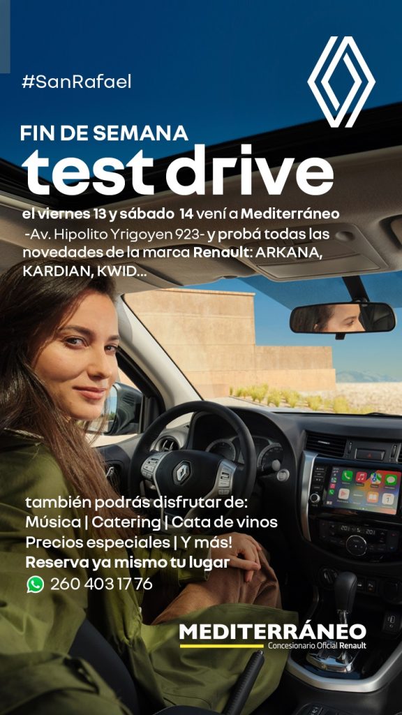 La concesionaria Renault Mediterráneo de San Rafael vivirá un fin de semana distinto con una propuesta que combina tecnología, familia y oportunidades comerciales. Durante el viernes 13 y sábado 14 de junio, en el local ubicado en avenida Hipólito Yrigoyen 923 se desarrollará una doble jornada de test drive en horario corrido de 9 a 21 horas, donde los asistentes podrán conocer, probar y consultar condiciones para acceder a toda la línea de vehículos de la marca. Además, como gran atractivo, se exhibirá y ofrecerá para test drive el nuevo Renault Arkana, un SUV de diseño deportivo y tecnología híbrida que marca un paso adelante en la oferta de la automotriz francesa, y también los modelos Kardian y Kwid.