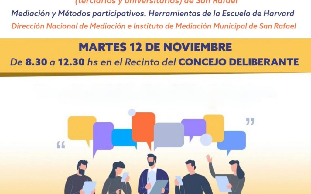 Adelantó que en el evento habrá presentes integrantes de la Dirección Nacional de Mediación, y hará la apertura el Dr. Juan María Luce, presidente del organismo. “De allí vamos a empezar con las primeras disertaciones, que las van a hacer mediadores muy prestigiosos de la Dirección Nacional, como el Dr. Daniel Precioso y la Dra. María del Rosario Saavedra. Ellos van a hablar sobre lo que son los conflictos en las escuelas. Después voy a continuar yo (en la otra mitad de la mañana), desarrollando lo que sería la mediación con los métodos participativos y algunas herramientas de la escuela de Harvard. La idea es también trabajar para que sea teórico y práctico”, planteó.