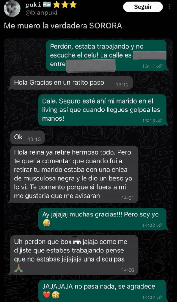 «Seguro esté mi marido en el living, así que cuando llegues golpeá las manos», fue el mensaje que se puede ver en la captura de pantalla de WhatsApp adjuntada por la autora. Menos de una hora después, la clienta le comunicó que los productos estaban «hermosos«.