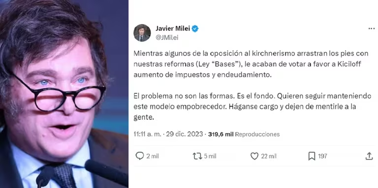 “Mientras algunos de la oposición al kirchnerismo arrastran los pies con nuestras reformas (Ley “Bases”), le acaban de votar a favor a Kiciloff aumento de impuestos y endeudamiento”, aseguró Javier Milei.