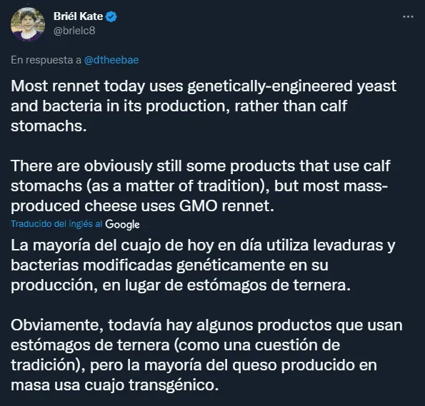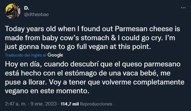 «Hoy, cuando descubrí que el queso parmesano está hecho con el estómago de una vaca bebé, me puse a llorar», indicó la usuaria en el tuit, dando a entender que nunca supo que eso era un ingrediente del queso.