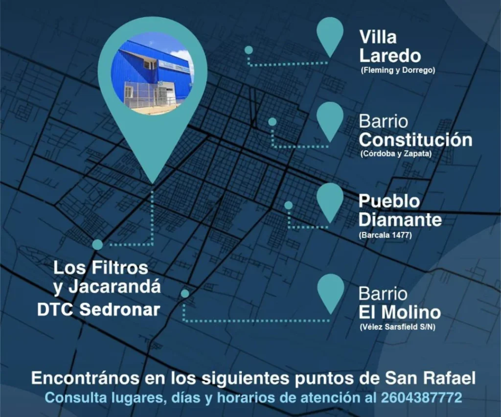 Para garantizar la accesibilidad de todos los vecinos, el dispositivo ha descentralizado su atención profesional, funcionando de manera estratégica en diversos centros de salud municipales y puntos clave de las barriadas de San Rafael. El núcleo de las actividades se encuentra en la Sede Central, el edificio histórico ubicado en la intersección de las calles Los Filtros y Jacarandá, en el barrio El Sosneado. Allí, el equipo recibe consultas de lunes a viernes en una doble franja horaria: por la mañana de 8:00 a 13:00 y por la tarde de 14:00 a 18:00 horas, centralizando los programas de asesoramiento y las actividades promocionales.