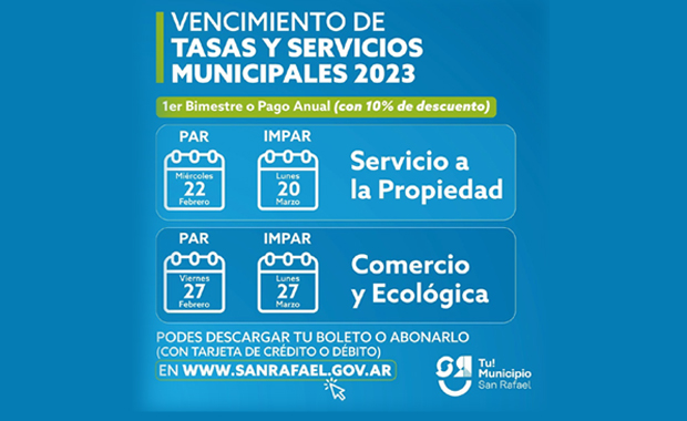 El municipio de San Rafael informó que ya se encuentran disponibles los boletos de las tasas municipales 2023. Para este año, el vencimiento del primer bimestre de las tasas de servicios para números pares, opera el miércoles 22 de febrero, mientras que para números impares, el lunes 20 de marzo. La titular de Recaudación del Municipio, Antonella Cristofanelli, brindó algunos detalles sobre los vencimientos y las novedades que se presentan para quienes tengan algún tipo de deuda.