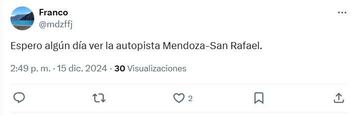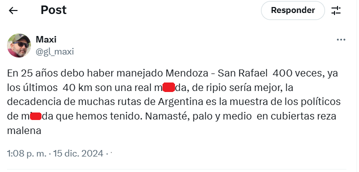 El usuario de X @gl_maxi fue muy duro con su posteo. “En 25 años debo haber manejado Mendoza – San Rafael 400 veces, ya los últimos 40 km son una real mxxxxa, de ripio sería mejor”, destacó.