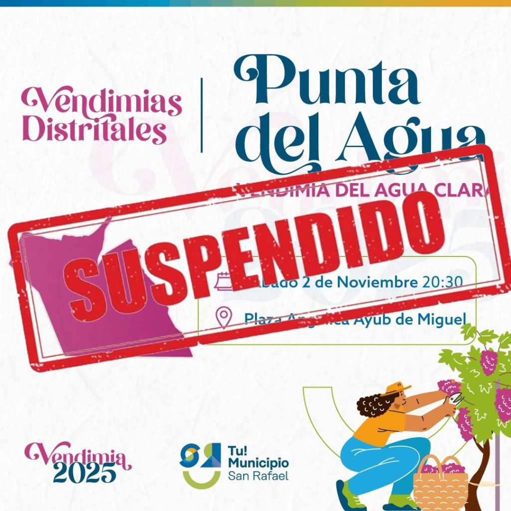 En el marco de las consecuencias que ayer provocó la feroz tormenta de granizo en diferentes zonas de San Rafael, el Municipio decidió suspender la Fiesta de la Vendimia de Punta del Agua, a modo de solidaridad con agricultores que en las últimas horas sufrieron graves pérdidas en su producción.