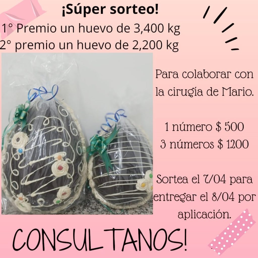 Los huevos que se sortean el 7 de abril pesan 3,400 kg. y el otro 2,200 kg. Los números del sorteo tienen un valor de uno por 500 pesos o tres números por 1200 pesos, y hay tiempo para comprarlos hasta el viernes 7 de abril. Los números pueden comprarse solicitándolos a través de Facebook, buscando “Mario Andrés Méndez”; en Intagram “mario.a.mendez”; mediante el número 2604033961; o en cotillón Arco, Panadería Moreno y pastelería Pastella.