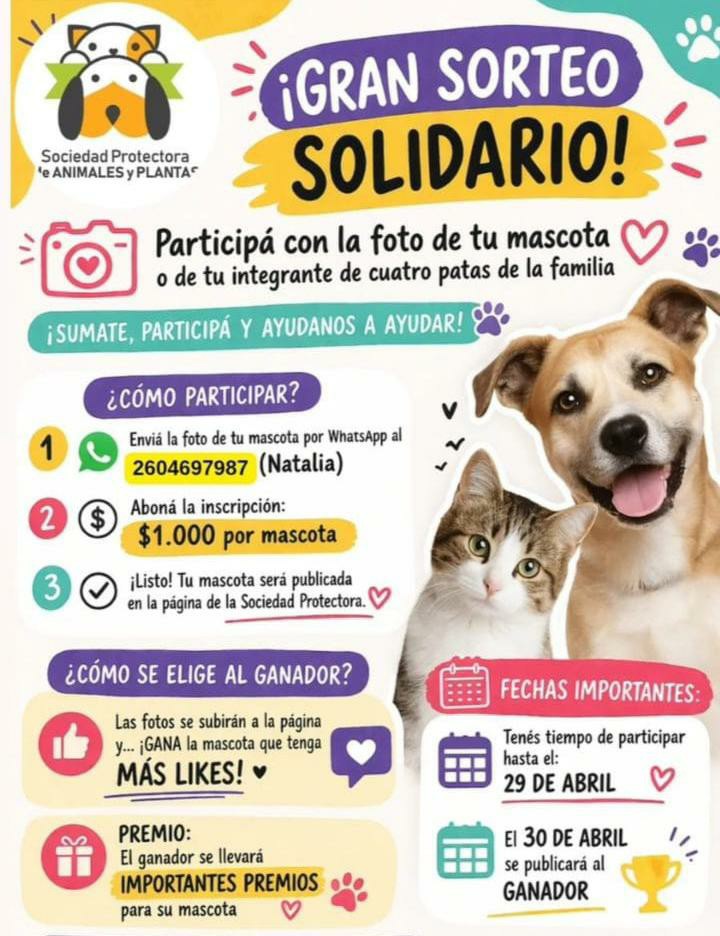 La Sociedad Protectora de Animales y Plantas impulsa una iniciativa solidaria que combina la participación de la comunidad con la recaudación de fondos destinados a cubrir gastos veterinarios. Se trata de un sorteo en el que los participantes envían una foto de su mascota, realizan una transferencia de $1.000 por imagen y compiten por premios a través de la cantidad de “me gusta” que obtenga cada publicación en redes sociales. Esta iniciativa se da en el marco del Día del Animal, que se celebra el 29 de abril.