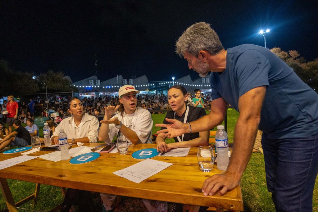 Durante las jornadas, el ambiente fue festivo y familiar. Muchas personas llegaron en grupos de amigos, en pareja, con sus familias, solos, solas y hasta con sus mascotas, ya que el evento fue pet friendly. El público se acomodó en el amplio espacio verde de la Nave Cultural, algunos en mesitas individuales, otros en mesones compartidos o directamente sentados sobre el pasto, disfrutando de la noche mientras degustaban hamburguesas y seguían con atención cada instancia de la competencia. Incluso, hubo quienes llevaron su mate para acompañar la cena, en una postal bien mendocina.