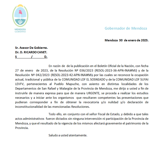 Mediante Twitter, el gobernador Rodolfo Suarez informó el pedido que realizó esta mañana solicitando se declare inconstitucional la resolución que otorga tierra en San Rafael y Malargüe a pseudo mapuches. La nota está dirigida a Ricardo Canet, asesor de Gobierno de la Nación. A continuación lo que posteó Suarez: