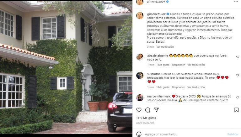 «Gracias a todos los que se preocuparon por saber cómo estamos. Tuvimos en casa un corto circuito eléctrico provocado por la lluvia y un enchufe del jardín. Por suerte nosotras estábamos despiertas y empezamos a sentir humo, llamamos a los bomberos y llegaron inmediatamente. Todo fue rápidamente solucionado. No se como trascendió, pero gracias a Dios no fue mas que un susto. Besos!», escribió.