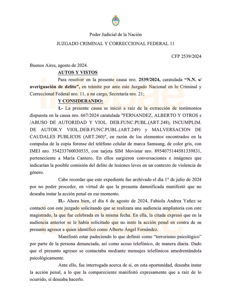 Todo comenzó con una serie de mensajes encontrados en el celular de María Cantero, ex secretaria de Alberto Fernández, en el marco de la investigación por los seguros. En una de esas conversaciones, con Yañez, se hablaba de supuestos actos de violencia. Ercolini resguardó ese material en un legajo reservado, notificó a la Oficina de Violencia de Género de la Corte Suprema, y luego convocó a la ex primera dama a una audiencia mediante videoconferencia desde Madrid, ciudad donde sigue viviendo.