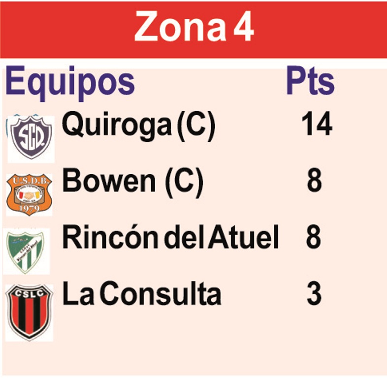 Y en la zona 4, Sport Club Quiroga de San Rafael clasificó 1° y de manera invicta, superando el domingo a La Consulta por 4-0. Además, la Unión Social y Deportiva Bowen de General Alvear venció a Rincón del Atuel de San Rafael como visitante por 3-1.