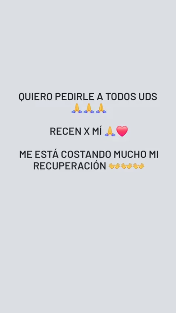 Durante su internación, recurrió a sus redes sociales para pedir apoyo espiritual: “Quiero pedirle a todos ustedes que recen por mí. Me está costando mucho mi recuperación”, escribió en una historia de Instagram.