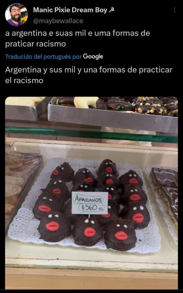 Cuando entró, se dispuso a mirar la vidriera con atención. Allí había varias opciones para elegir, pero una en específico llamó su atención: «Argentina y sus mil y una formas de practicar el racismo«, escribió en la descripción del tuit. En la foto se puede ver claramente un producto comestible dulce.