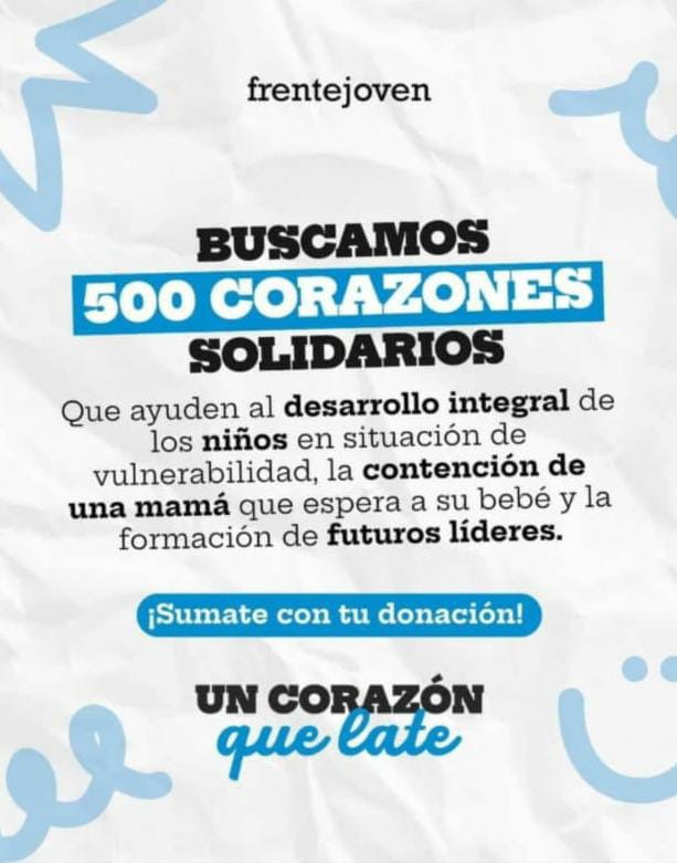 Lo que buscan ante esto, son donantes mensuales, aunque pueden llevarse a cabo donaciones únicas. Todo se realiza mediante un link, el cual está presente dentro de la página de Frente Joven Argentina. Si no, para quien esté interesados dejó el número de teléfono 2604677589.