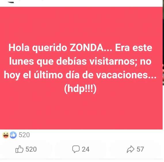 Fue a través de un grupo de Facebook denominado Docentes de Mendoza, en el que el hombre escribió: «Hola querido ZONDA… Era este lunes que debías visitarnos; no hoy el último día de vacaciones… (hdp!!!)».