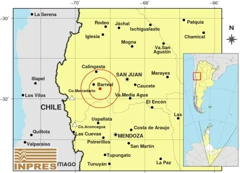 El epicentro fue en San Juan, cercano a la zona de Barreal y a 79 kilómetros al oeste de dicha provincia con distancia de 131 kilómetros del norte de la provincia de Mendoza. Tuvo una profundidad de 113 kilómetros.