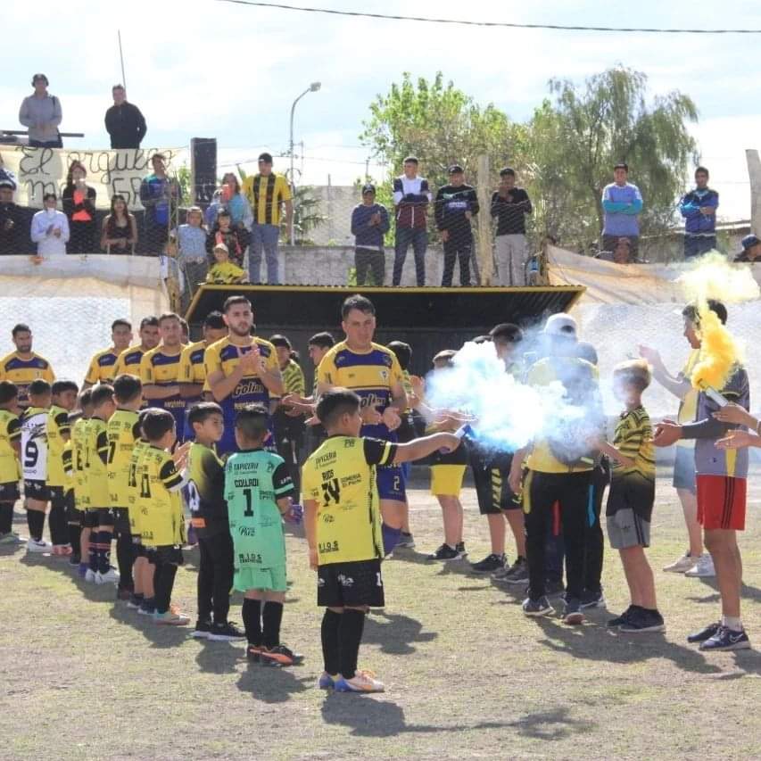 Para recibir al ganador del torneo, los dirigentes del club “Canario” dispusieron un “pasillo de honor”, conformado por jugadores de las divisiones inferiores de la institución, quienes con aplausos y bengalas azules y amarillas acompañaron el ingreso al campo de juego del plantel de Pueblo Diamante.