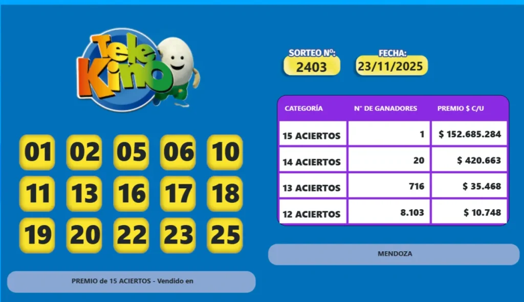 El Telekino volvió a repartir millones este domingo, y esta vez el golpe de suerte tuvo destino mendocino. En el sorteo número 2403, un apostador local acertó los 15 números y se quedó con $152.685.284.
