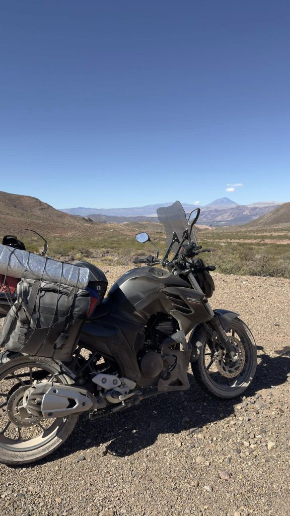 “Ya empieza a sentirse el viento y el frescor. Hermosa ruta, sumando experiencia de manejo en vientos, primera vez y con mucho respeto”, relató el motociclista al compartir imágenes del recorrido. En ese tramo también destacó su sorpresa al ver un volcán por primera vez durante la travesía.