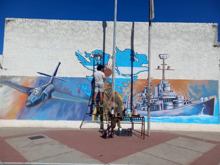 En relación con los detalles de la obra, la docente precisó: “Está en el patio, está de fondo, digamos atrás del mástil, y hay un soldado que mide por lo menos un metro y medio o dos, y el mural es de siete metros por cuatro o cinco. Es realmente muy grande, es increíble verlo. Están representadas las fuerzas aéreas, hay un avión, que es el avión que estuvo en Malvinas, el General Belgrano, un soldado y las Malvinas atrás con un sol”.