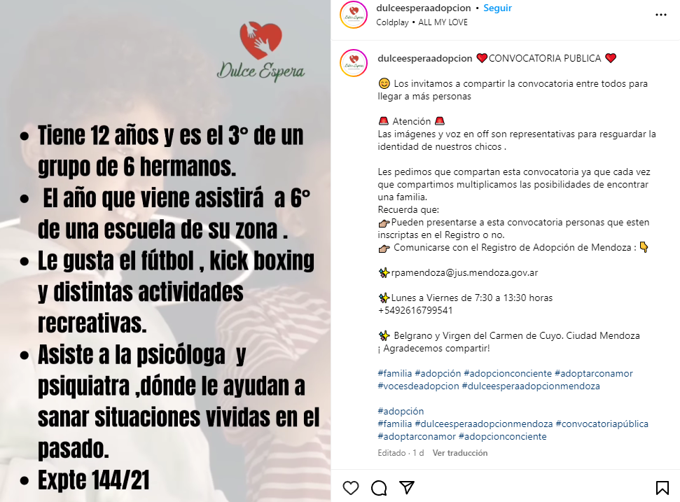 Dulce Espera es una entidad que promueve derecho de niños/as y adolescentes a crecer en una familia. “Durante la espera de una dulce adopción, te acompañamos y formamos”, destacan desde sus redes.