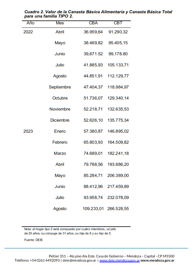 Con el salto de la inflación, que llegó en agosto a 12,2% en Mendoza, este viernes se conoció el incremento en el mismo período de la Canasta Básica Total. Una familia mendocina tuvo que contar con $266.528,55 para evitar caer en la pobreza.