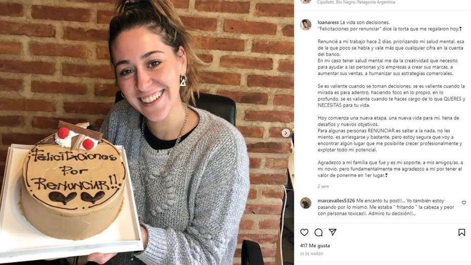 Loana Reser tiene 28 años y vive en Cipolletti, Río Negro. Ella decidió renunciar al trabajo en el que estaba hace más de dos años, dedicado al marketing digital.