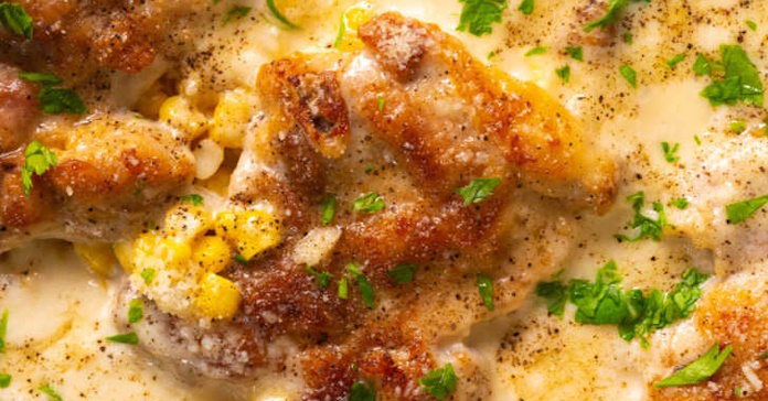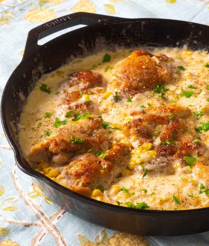 Mi cena ideal entre semana es aquella que tarda treinta minutos o menos en prepararse, utiliza ingredientes que normalmente tengo a mano y, lo más importante, es deliciosa. Estos muslos de pollo con crema de maíz cumplen con todos esos frentes. La combinación de pollo crujiente salado y sabroso y maíz dulce y cremoso aquí es una revelación (en serio, nunca escucharás una queja cuando esto se ponga en la mesa) y su preparación rápida y sencilla en la estufa lo hace aún más atractivo.