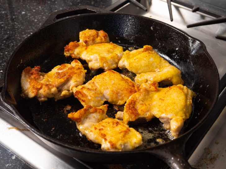 Aquí puedes usar muslos de pollo con o sin piel; cualquiera de los dos funciona bien, solo depende de si eres fanático de la piel de pollo crujiente o no. Incluso si opta por sin piel, aún obtendrá una agradable capa crujiente aquí, porque los muslos se espolvorean con harina antes de saltar a una sartén para que queden bien dorados.