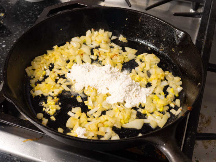 Una vez que el pollo esté dorado, lo retiras de la sartén para trabajar con el resto del plato, que comienza con mantequilla, cebolla, ajo y un poco de harina.