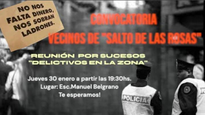 El encuentro se llevará a cabo en la Escuela Manuel Belgrano hoy jueves a partir de las 19:30, y la convocatoria no se limita solo a los vecinos de Salto de las Rosas, sino también a quienes residen en las zonas aledañas. “Necesitamos que nos escuchen, que haya más patrullajes, más seguridad. No sabemos qué medidas pueden tomar, pero algo tienen que hacer”, señaló.