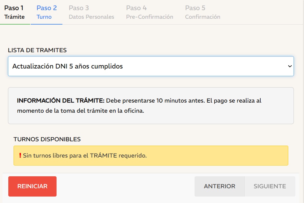 La plataforma, única vía habilitada para la gestión de turnos, arroja de manera constante el mismo mensaje: «Sin turnos libres para el trámite requerido».