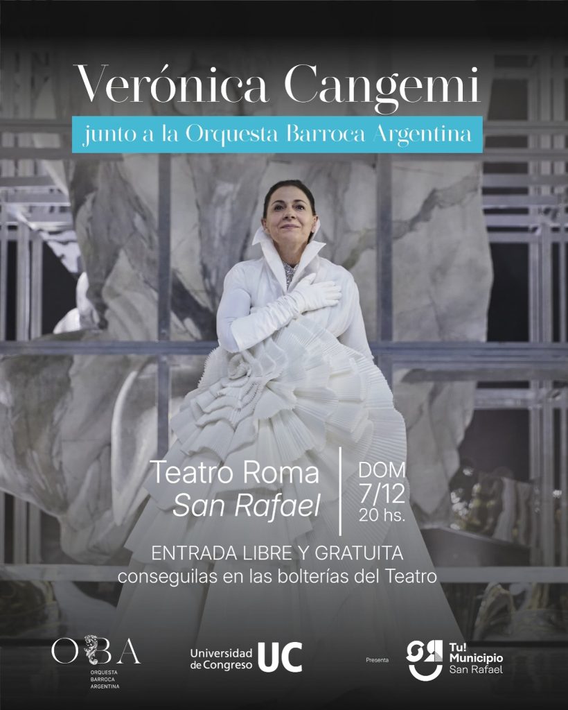 La presentación, con el auspicio de Cultura de la Municipalidad, será el domingo 7 a las 20 en el Cine Teatro Roma, junto a la Orquesta Barroca Argentina con entrada libre y gratuita. Este concierto es especial, ya que celebra el décimo aniversario del nacimiento del ensamble. «En el Cine Teatro Roma vamos a presentarnos con una orquesta que nació en Mendoza y San Rafael con la Universidad de Congreso. Yo creé esta orquesta repatriando músicos argentinos que están en Europa, quienes se juntan una vez al año», comentó Cangemi en otro tramo de la charla.