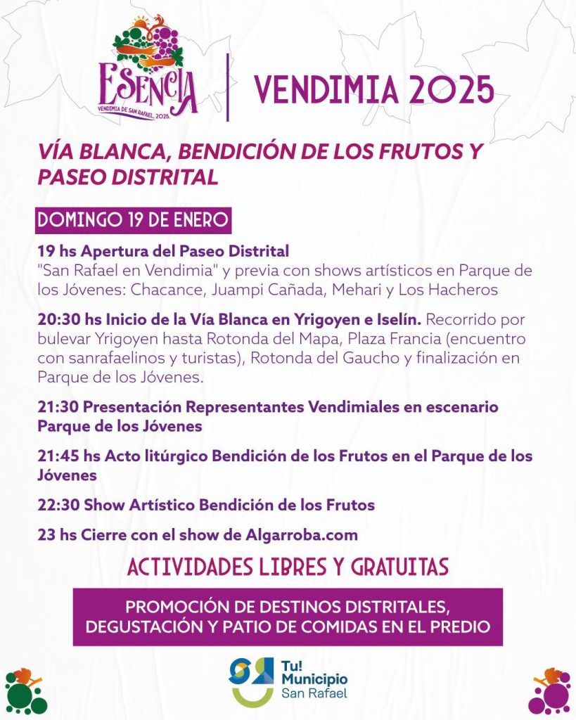 19 hs: Apertura del Paseo Distrital “San Rafael en Vendimia” con promoción de destinos distritales, exhibición de productos, degustaciones, patio de comidas, entre muchas más atracciones.