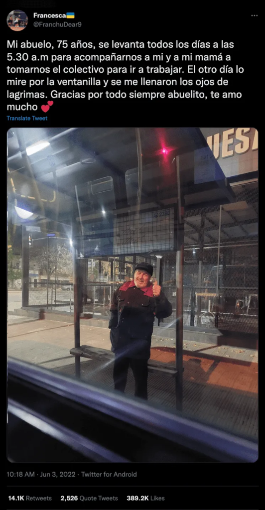 «Mi abuelo, 75 años. Se levanta todos los días a las 5.30 a.m. para acompañarnos a mí y a mi mamá a tomarnos el colectivo para ir a trabajar», comenzó escribiendo en Twitter la usuaria conocida como @FranchuDear9.