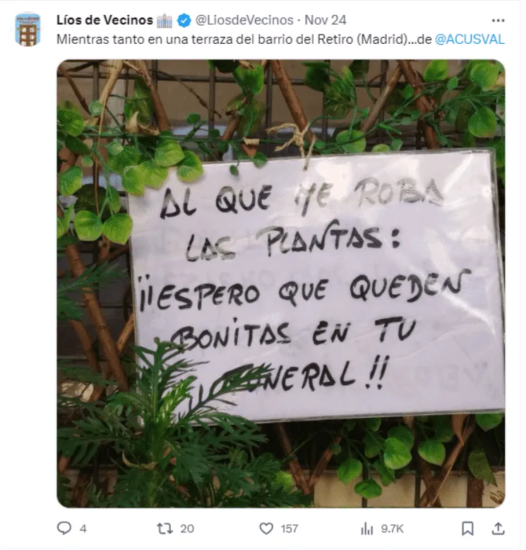 Este residente del barrio del Retiro, en Madrid, se cansó de que un ladrón anónimo le robara las plantas de la terraza y dejó un contundente mensaje para quien se hiciera cargo: “Al que me roba las plantas: ¡¡Espero que queden bonitas en tu funeral!!”.