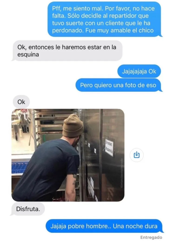 Tras esta postura del restaurante, el cliente destacó que “la atención del nuevo delivery había sido muy buena” y que no quería que haya pasado un mal momento laboral por esta situación. “Le haremos estar en la esquina», manifestaron.
