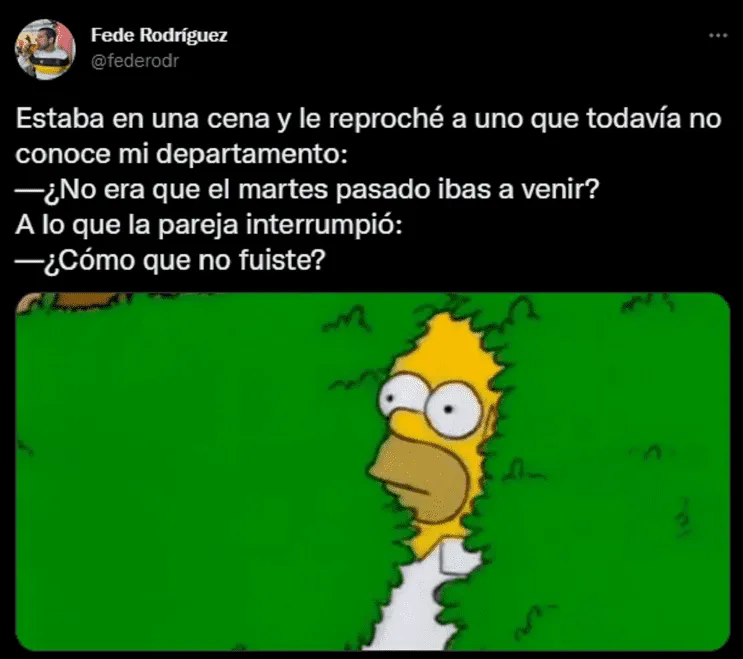 «Estaba en una cena y le reproché a uno que todavía no conoce mi departamento: ‘¿No era que el martes pasado ibas a venir?’«, comienza el tuit. Lo que parece una pregunta simple, en realidad fue una metida de pata.