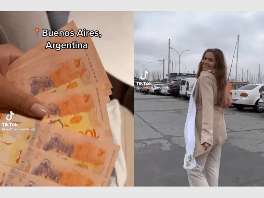 “Miren estos fajos de billetes, el dinero que ven acá son 40 dólares”, dice la joven estadounidense mientras muestra a cámara una gran cantidad de billetes de $1000 y $500. Acto seguido, explicó por qué tenía tanto dinero en sus manos: “Es tan barato para un americano viajar a la Argentina”.