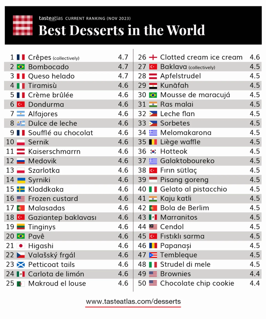 El primer lugar fue para Francia con las Crepes, que obtuvo 4,7 puntos. Aunque, con el mismo puntaje, pero en el segundo puesto, se ubica el Bombocado brasileño, que se prepara con queso blanco, coco rallado, harina, leche, mantequilla, huevos y azúcar. Mientras que la Argentina consiguió el séptimo puesto con el tradicional alfajor de maicena con un 4,6.