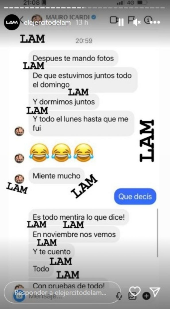 «Después te mando fotos de que estuvimos juntos todo el domingo y dormimos juntos. Y todo el lunes hasta que me fui. Miente mucho, ¡es todo mentira lo que dice! En noviembre nos vemos y te cuento todo, con pruebas de todo», leyó Ángel De Brito el mensaje que le envió Icardi en ese mismo momento.