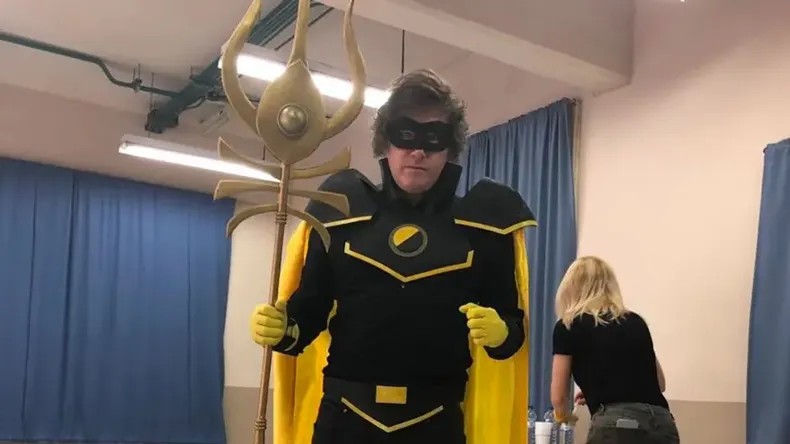 Milei hizo cosplay del God Emperor Ancap por primera vez en 2019 para asistir a la Otacon Party realizada por Jigoku Producciones. Además de la maquilladora, lo acompañó el Partido Libertario para sumar afiliados en el evento.