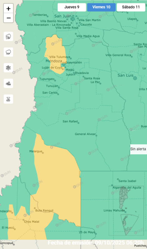 La alerta amarilla del Servicio Meteorológico Nacional expresa que las zonas más afectadas comprenden los departamentos de Malargüe, Luján de Cuyo, Lavalle, Las Heras, especialmente la precordillera.